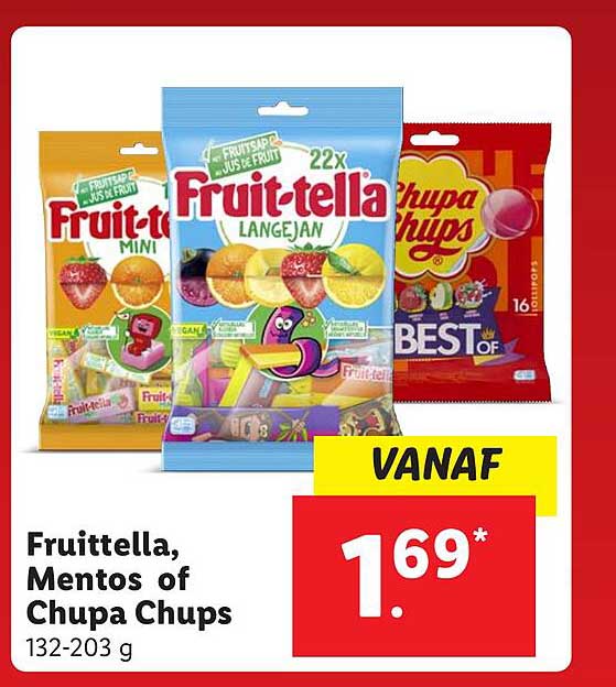 Bekijk de Fruitella, Mentos Of Chupa Chups aanbieding bij Lidl! Deze fantastische aanbieding is nu beschikbaar in de nieuwste Lidl folder. Profiteer van deze kans en bespaar flink op je aankoop.