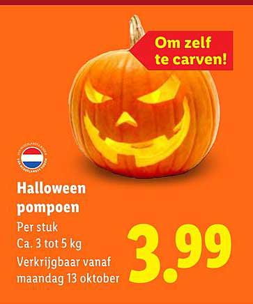 Bekijk nu de Halloween pompoen aanbieding in de Lidl folder. Deze aanbieding is geldig van 13-10-2025 tot en met 19-10-2025.