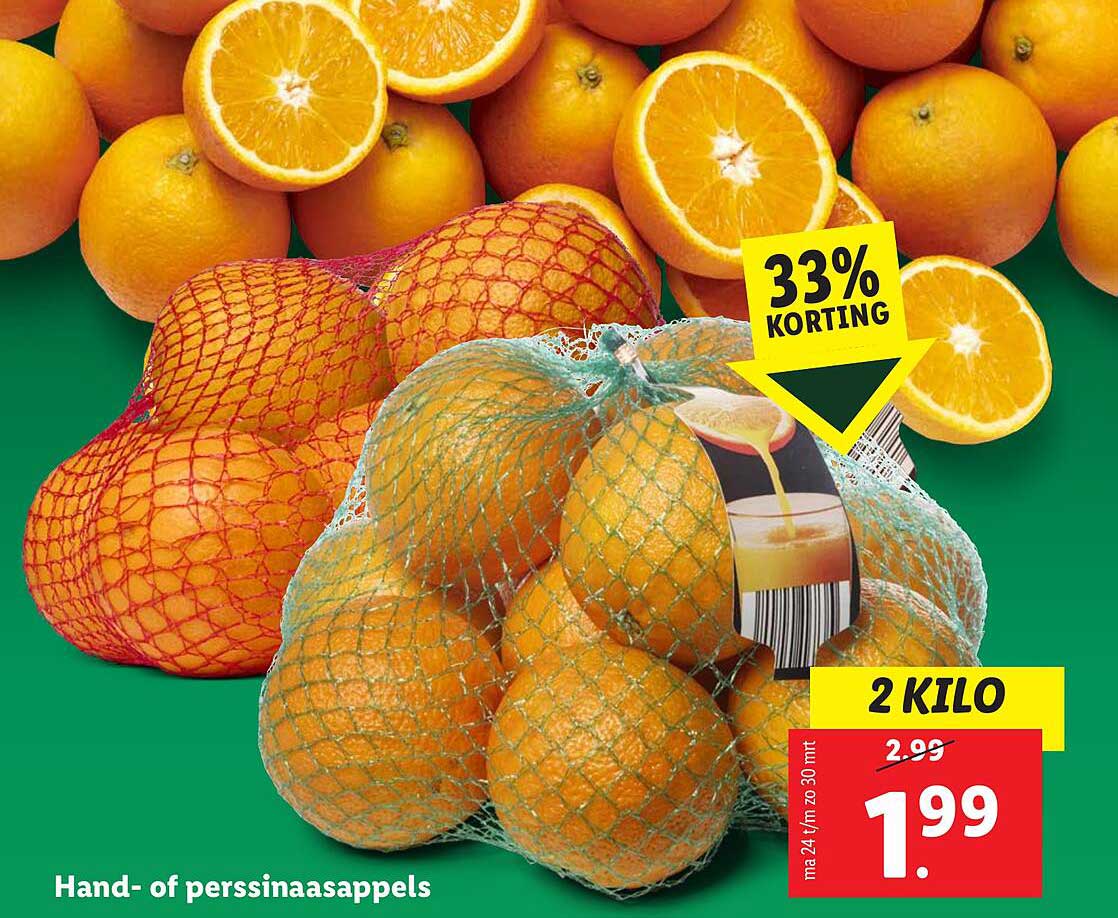 Bekijk nu de Hand- of perssinaasappels 2 kilo aanbieding in de Lidl folder. Deze aanbieding is geldig van 24-03-2025 tot en met 30-03-2025.