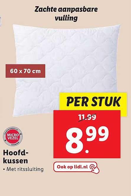Bekijk de Hoofdkussen aanbieding bij Lidl! Deze fantastische aanbieding is nu beschikbaar in de nieuwste Lidl folder. Profiteer van deze kans en bespaar flink op je aankoop.
