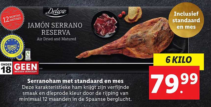 Ontdek de geweldige Jamón Serrano Reserva aanbieding in de nieuwste Lidl folder. Naast deze aanbieding vind je nog veel meer aantrekkelijke kortingen. Je kunt de Jamón Serrano Reserva eenvoudig online bestellen via de Lidl website of kopen in een winkel bij jou in de buurt.