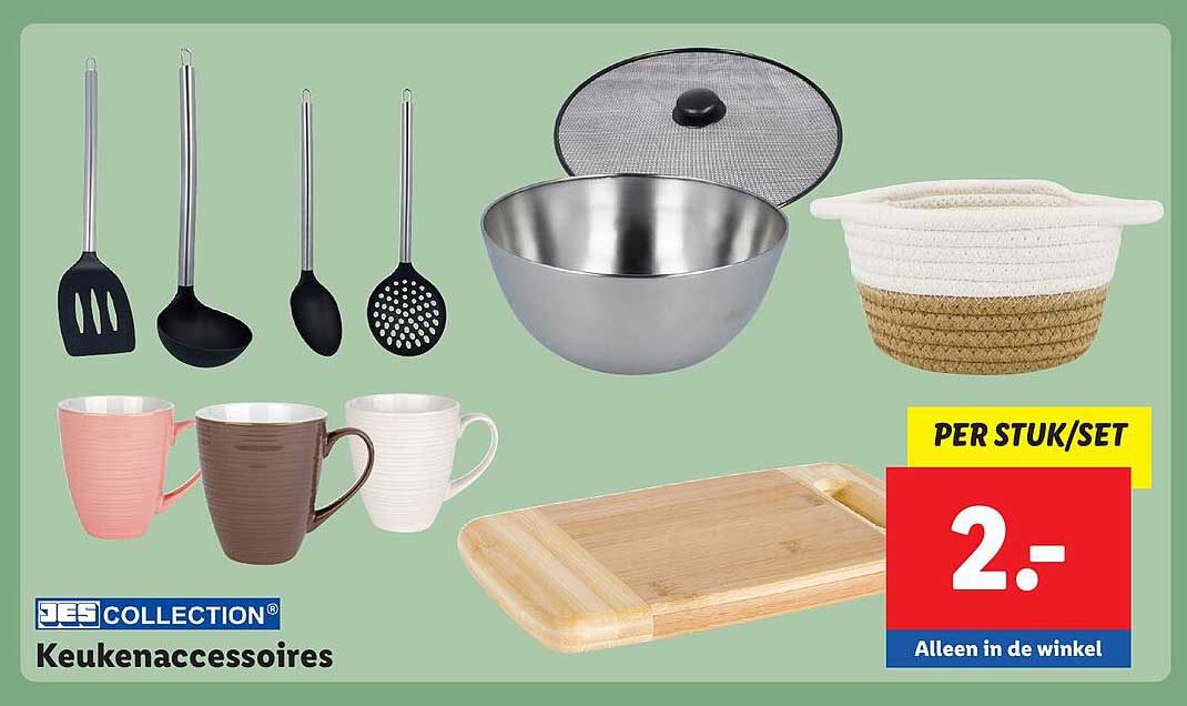 Bekijk de Jes Collection Keukenaccessoires aanbieding bij Lidl! Deze fantastische aanbieding is nu beschikbaar in de nieuwste Lidl folder. Profiteer van deze kans en bespaar flink op je aankoop.