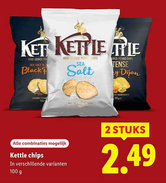 Voor slechts €2,49 kun je twee pakken Kettle chips kopen! Dit is niet alleen een geweldige aanbieding, maar je krijgt ook de mogelijkheid om verschillende smaken te kiezen. Vergelijk dat met de reguliere prijs en je ziet al snel dat dit een aanbod is dat je niet wilt missen. Ideaal om in te slaan voor een feestje of een gezellige avond thuis.