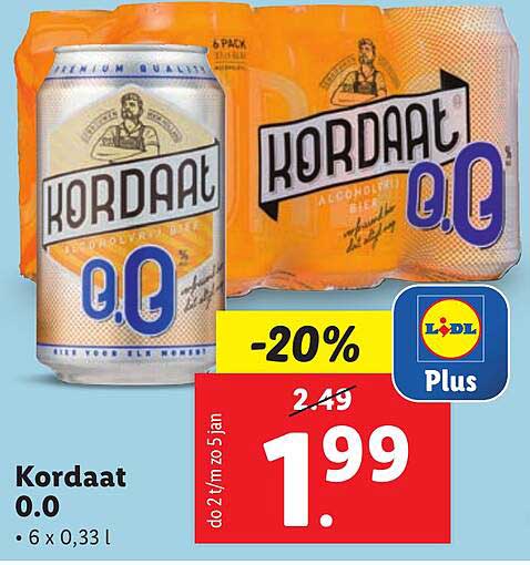 Bekijk nu de Kordaat 0.0 aanbieding in de Lidl folder. Deze aanbieding is geldig van 30-12-2024 tot en met 05-01-2025.