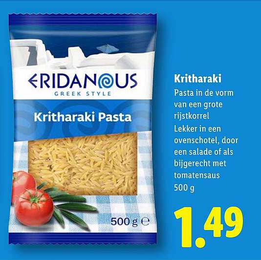 Bekijk nu de Kritharakipasta 500 g aanbieding in de Lidl folder. Deze aanbieding is geldig van 07-07-2025 tot en met 13-07-2025.