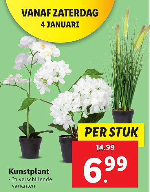 Bekijk de Kunstplant aanbieding bij Lidl! Deze fantastische aanbieding is nu beschikbaar in de nieuwste Lidl folder. Profiteer van deze kans en bespaar flink op je aankoop.