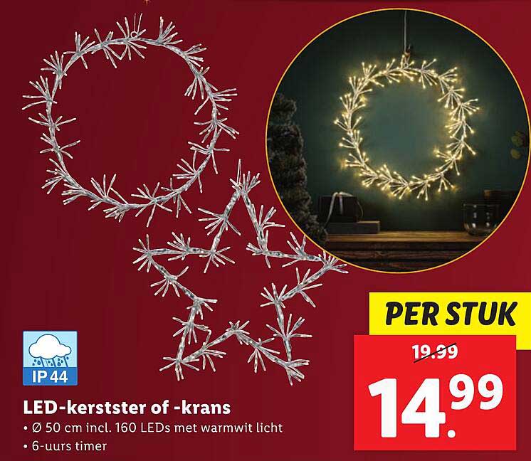 Bekijk de Led-Kerstster Of -Krans aanbieding bij Lidl! Deze fantastische aanbieding is nu beschikbaar in de nieuwste Lidl folder. Profiteer van deze kans en bespaar flink op je aankoop.