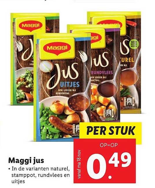 Bekijk de Maggi Jus aanbieding bij Lidl! Deze fantastische aanbieding is nu beschikbaar in de nieuwste Lidl folder. Profiteer van deze kans en bespaar flink op je aankoop.