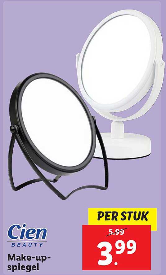 Normaal gesproken kost de Cien make-up-spiegel €5,99, maar tijdens deze aanbieding kun je hem aanschaffen voor slechts €3,99. Dat is een korting van maar liefst €2! Waarom zou je deze kans voorbij laten gaan? Dit zijn de perfecte momenten om slimme aankopen te doen en flink te besparen.