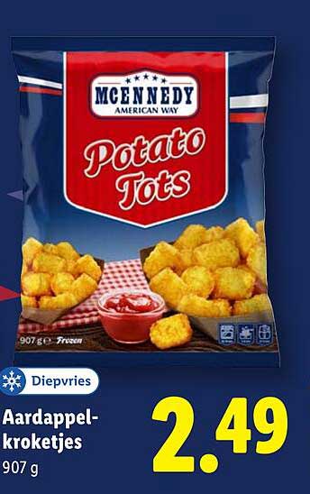 Bekijk nu de Mcennedy Potato Tots Aardappelkroketjes 907 g aanbieding in de Lidl folder. Deze aanbieding is geldig van 23-06-2025 tot en met 29-06-2025.