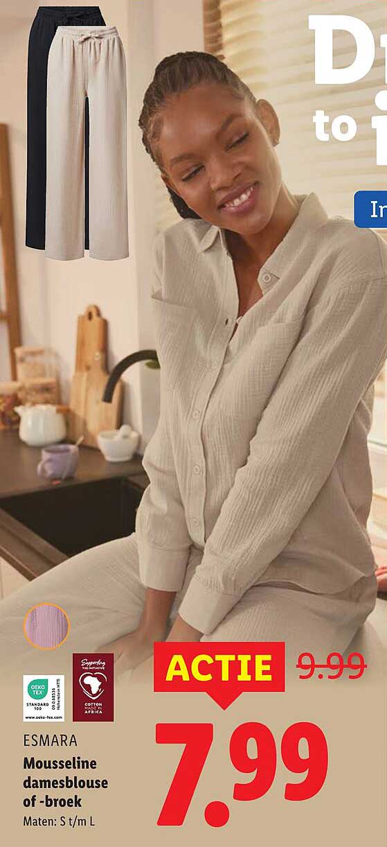 Bekijk nu de Mousseline damesblouse of -broek aanbieding in de Lidl folder. Deze aanbieding is geldig van 23-07-2025 tot en met 26-07-2025.