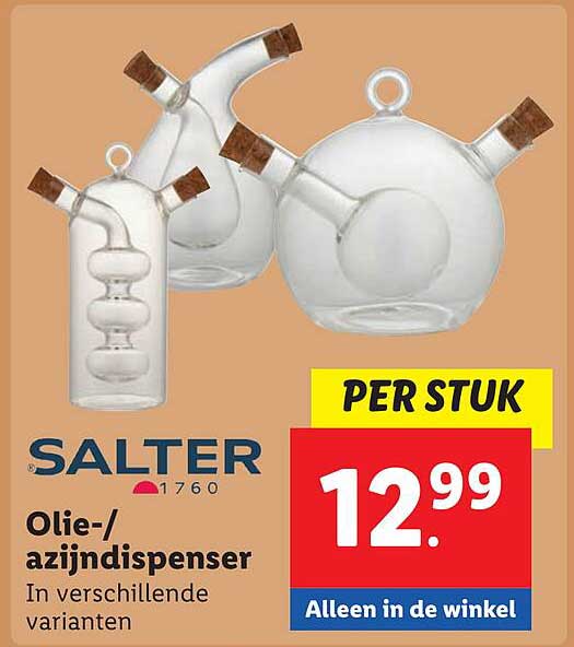 Ben je op zoek naar een stijlvolle en functionele manier om olie en azijn te serveren? Dan is de olie-/azijndispenser van Salter precies wat je nodig hebt! Deze dispenser komt in verschillende varianten en voegt niet alleen functionaliteit toe aan je tafel, maar ook een vleugje elegantie. Tijdens de aanbieding van 2025-06-02 tot en met 2025-06-08 kun je profiteren van deze geweldige deal in de Lidl!