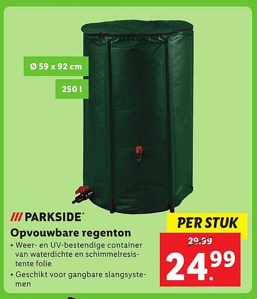 Heb je altijd al willen genieten van een efficiënte en duurzame manier om regenwater op te vangen? Dan is de opvouwbare regenton van PARKSIDE de perfecte oplossing! Met een capaciteit van 250 liter en een stevige constructie is dit de ideale keuze voor elke tuinliefhebber. Deze aanbieding, geldig van 14 tot en met 20 april 2025, biedt je de kans om deze handige regenton te scoren voor een aantrekkelijke prijs.