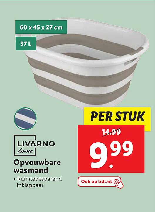 Bekijk de Opvouwbare Wasmand aanbieding bij Lidl! Deze fantastische aanbieding is nu beschikbaar in de nieuwste Lidl folder. Profiteer van deze kans en bespaar flink op je aankoop.