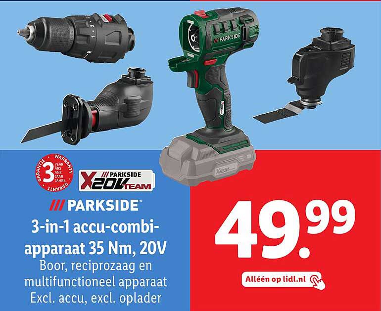 Bekijk de Parkside 3-In-1 Accu-Combi-Apparaat 35 Nm, 20V aanbieding bij Lidl! Deze fantastische aanbieding is nu beschikbaar in de nieuwste Lidl folder. Profiteer van deze kans en bespaar flink op je aankoop.