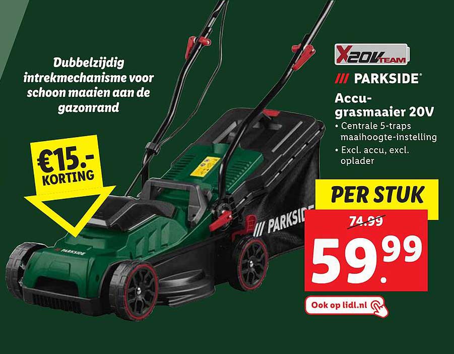 Bekijk de Parkside Accu-Grasmaaier 20V aanbieding bij Lidl! Deze fantastische aanbieding is nu beschikbaar in de nieuwste Lidl folder. Profiteer van deze kans en bespaar flink op je aankoop.