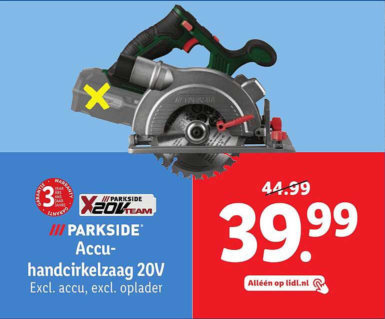 Ontdek de geweldige Parkside Accu-Handcirkelzaag 20V aanbieding in de nieuwste Lidl folder. Naast deze aanbieding vind je nog veel meer aantrekkelijke kortingen. Je kunt de Parkside Accu-Handcirkelzaag 20V eenvoudig online bestellen via de Lidl website of kopen in een winkel bij jou in de buurt.