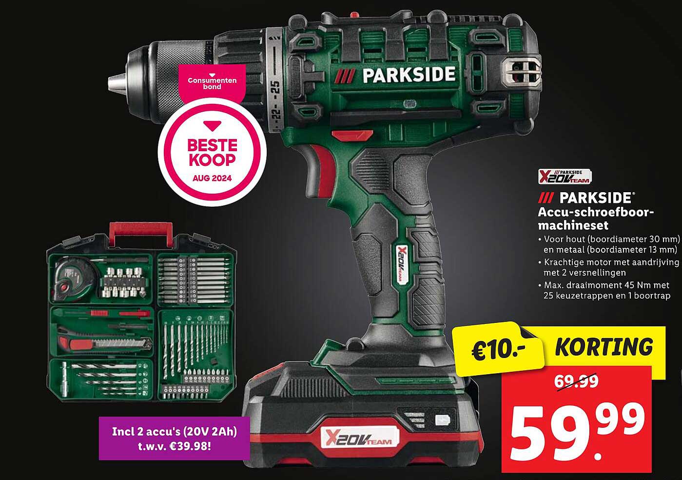 Ontdek de geweldige Parkside Accu-Schroefboormachine-Set aanbieding in de nieuwste Lidl folder. Naast deze aanbieding vind je nog veel meer aantrekkelijke kortingen. Je kunt de Parkside Accu-Schroefboormachine-Set eenvoudig online bestellen via de Lidl website of kopen in een winkel bij jou in de buurt.