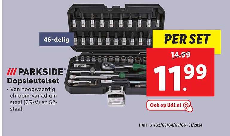 Bekijk de Parkside Dopsleutelset aanbieding bij Lidl! Deze fantastische aanbieding is nu beschikbaar in de nieuwste Lidl folder. Profiteer van deze kans en bespaar flink op je aankoop.