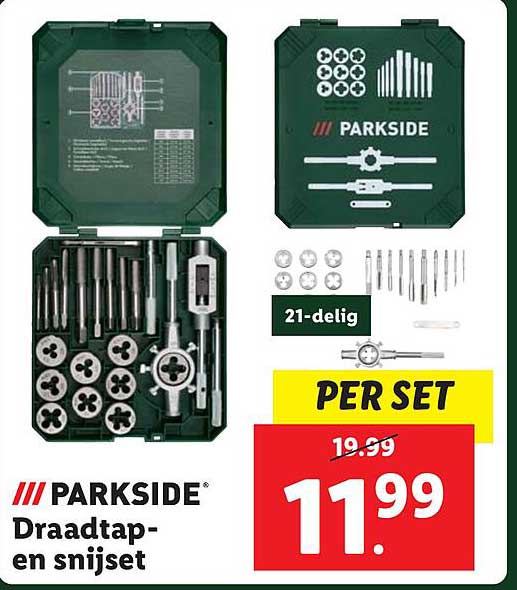 Bekijk nu de PARKSIDE Draadtap- en snijset 21-delig aanbieding in de Lidl folder. Deze aanbieding is geldig van 31-03-2025 tot en met 06-04-2025.