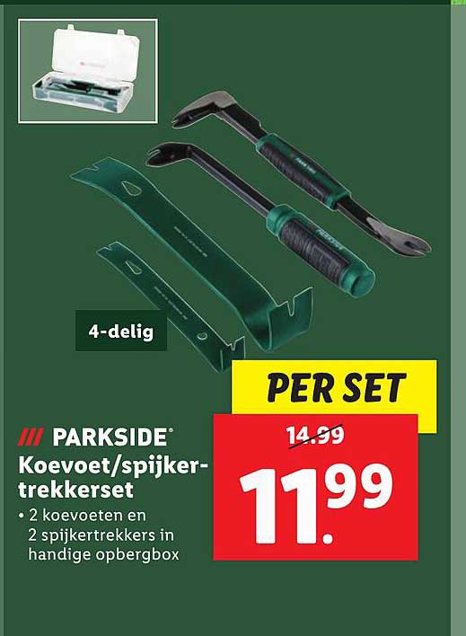 Bekijk de Parkside Koevoet/Spijkertrekkerset aanbieding bij Lidl! Deze fantastische aanbieding is nu beschikbaar in de nieuwste Lidl folder. Profiteer van deze kans en bespaar flink op je aankoop.