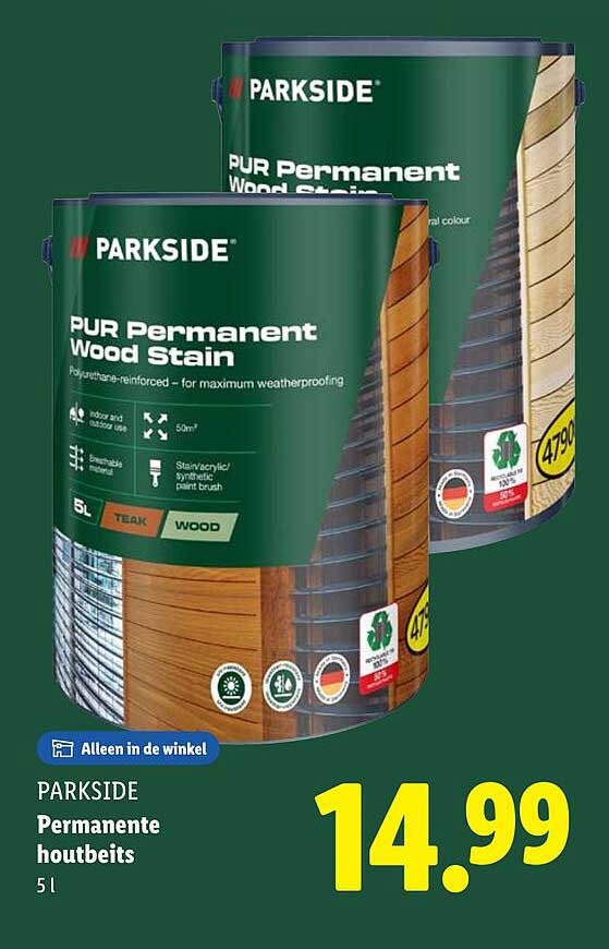Bekijk nu de PARKSIDE Permanente houtbeits 5L aanbieding in de Lidl folder. Deze aanbieding is geldig van 08-09-2025 tot en met 14-09-2025.