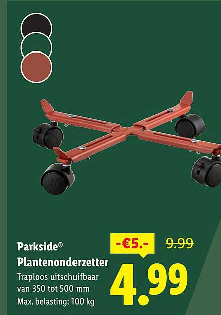 Heb je ooit moeite gehad met het verplaatsen van zware planten? Maak kennis met de Parkside® plantenonderzetter! Deze handige onderzetter is traploos uitschuifbaar van 350 tot 500 mm, waardoor hij perfect is voor verschillende plantformaten. Voor slechts €4.99 in plaats van €9.99 bespaar je €5,-. Deze aanbieding is slechts geldig van 15 oktober tot en met 18 oktober 2025, dus grijp je kans!
