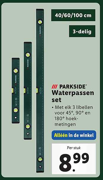 Ontdek de geweldige Parkside Waterpassen Set aanbieding in de nieuwste Lidl folder. Naast deze aanbieding vind je nog veel meer aantrekkelijke kortingen. Je kunt de Parkside Waterpassen Set eenvoudig online bestellen via de Lidl website of kopen in een winkel bij jou in de buurt.