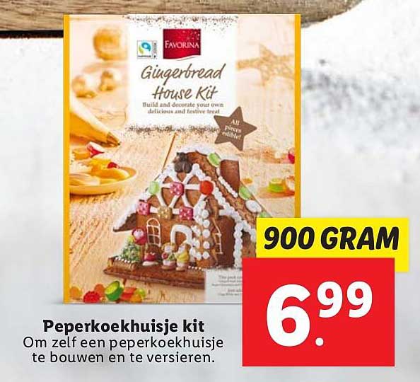 Bekijk nu de Peperkoekhuisje kit aanbieding in de Lidl folder. Deze aanbieding is geldig van 28-11-2024 tot en met 26-12-2024.