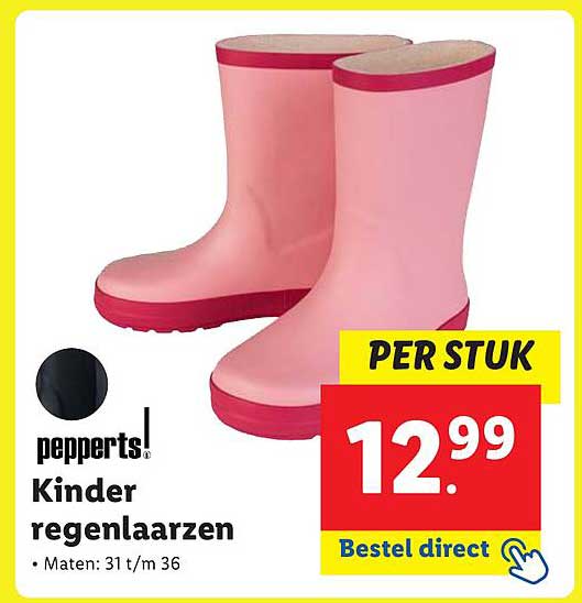 Bekijk de Pepperts! Kinder Regenlaarzen aanbieding bij Lidl! Deze fantastische aanbieding is nu beschikbaar in de nieuwste Lidl folder. Profiteer van deze kans en bespaar flink op je aankoop.