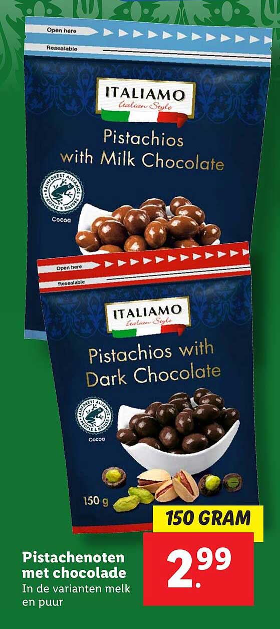 Heb je al gehoord van de heerlijke aanbieding bij Lidl? Van 22 april tot en met 27 april kun je genieten van de verrukkelijke pistachenoten met chocolade. Deze traktatie is perfect voor zowel een gezellige avond met vrienden als voor een klein momentje voor jezelf. De combinatie van zoutige pistachenoten en rijke chocolade maakt dit een onweerstaanbare snack die je niet wilt missen!
