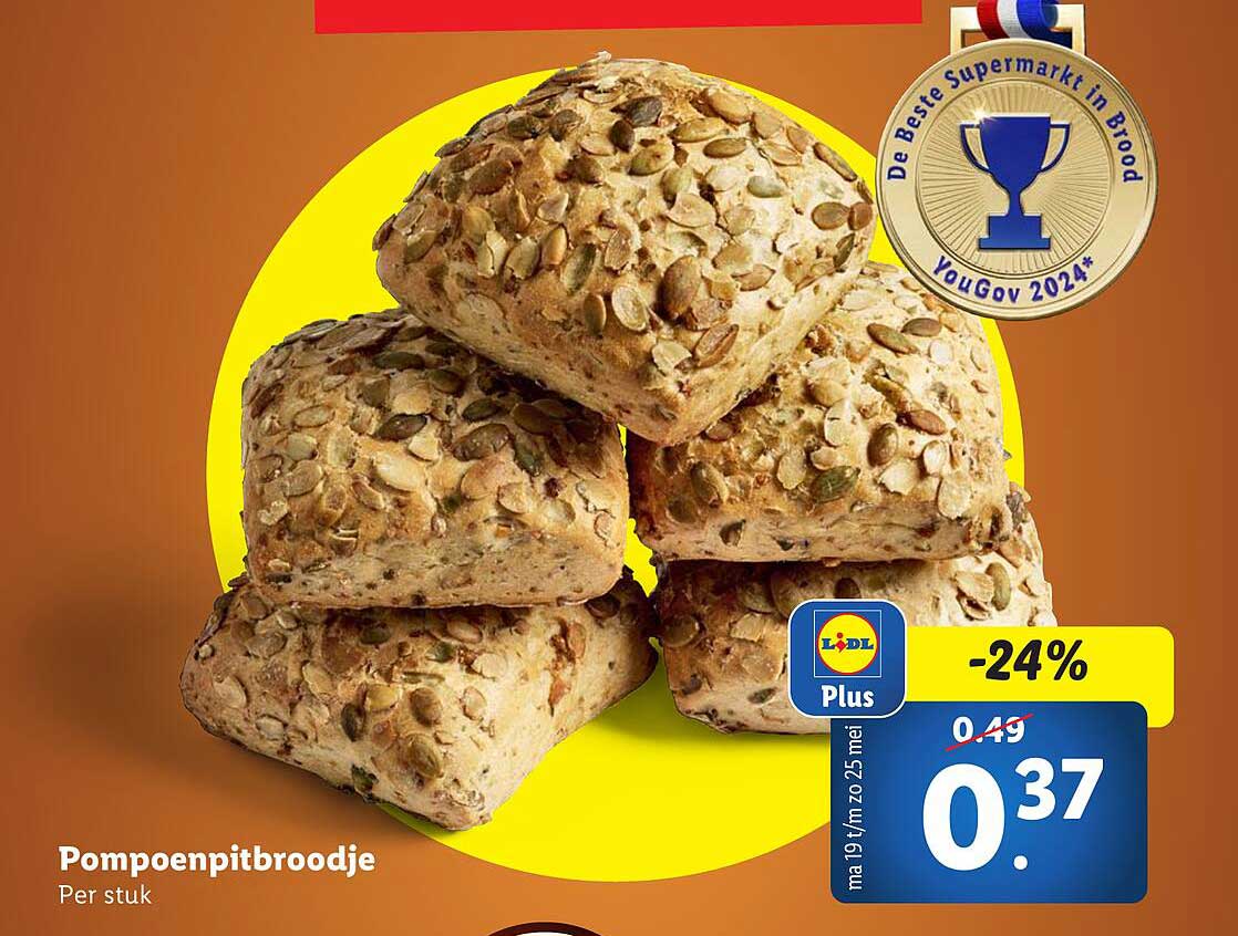 Bekijk nu de Pompoenpitbroodje aanbieding in de Lidl folder. Deze aanbieding is geldig van 19-05-2025 tot en met 25-05-2025.