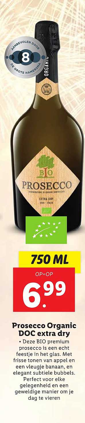 Bekijk de Prosecco Organic Doc Extra Dry aanbieding bij Lidl! Deze fantastische aanbieding is nu beschikbaar in de nieuwste Lidl folder. Profiteer van deze kans en bespaar flink op je aankoop.