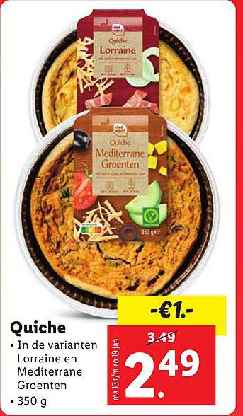 Bekijk nu de Quiche aanbieding in de Lidl folder. Deze aanbieding is geldig van 13-01-2025 tot en met 19-01-2025.