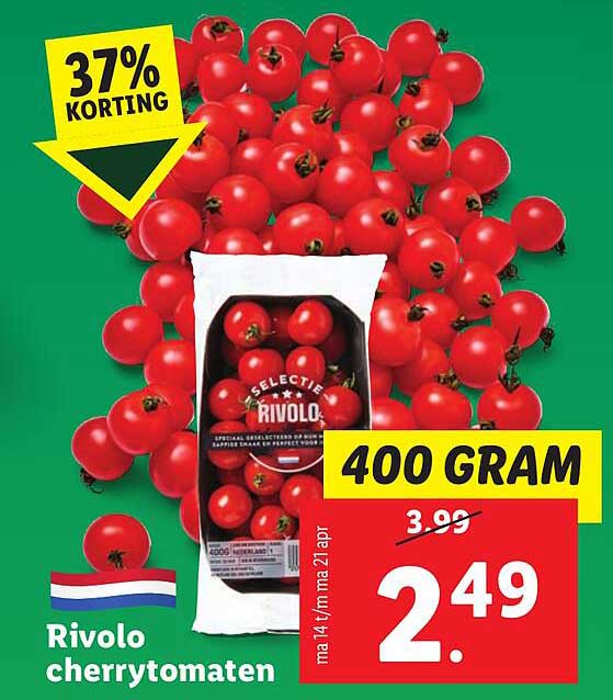 Bekijk nu de Rivolo cherrytomaten 400 gram aanbieding in de Lidl folder. Deze aanbieding is geldig van 14-04-2025 tot en met 20-04-2025.