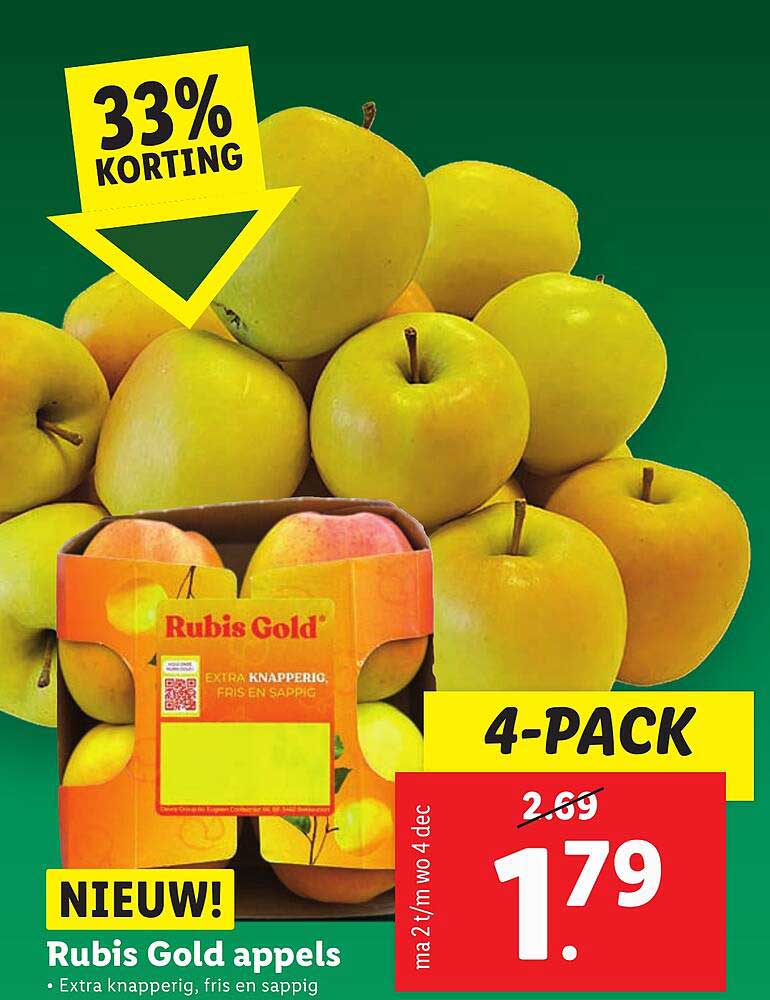 Bekijk nu de Rubis Gold appels aanbieding in de Lidl folder. Deze aanbieding is geldig van 02-12-2024 tot en met 07-12-2024.