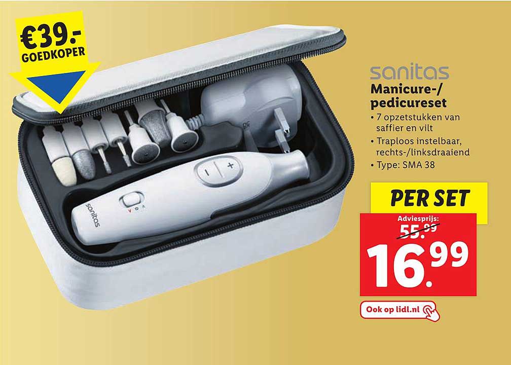 Bekijk de Sanitas Manicure-/Pedicureset aanbieding bij Lidl! Deze fantastische aanbieding is nu beschikbaar in de nieuwste Lidl folder. Profiteer van deze kans en bespaar flink op je aankoop.