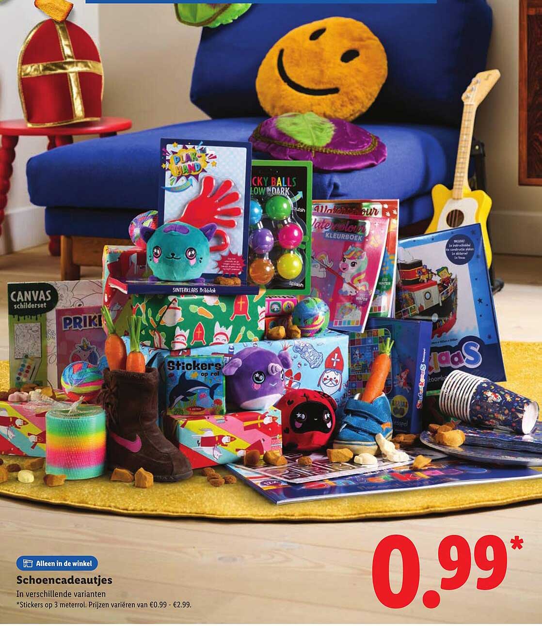 Bij Lidl kunnen kinderen zich deze week verheugen op een speciale aanbieding: schoencadeautjes! Deze schattige en kleurrijke cadeautjes zijn perfect voor in de schoen, vooral met Sinterklaas in het vooruitzicht. Met prijzen die beginnen vanaf maar liefst €0,99, is het een geweldige kans om de schoen van je kind te vullen met kleine, leuke verrassingen waar ze dol op zullen zijn.