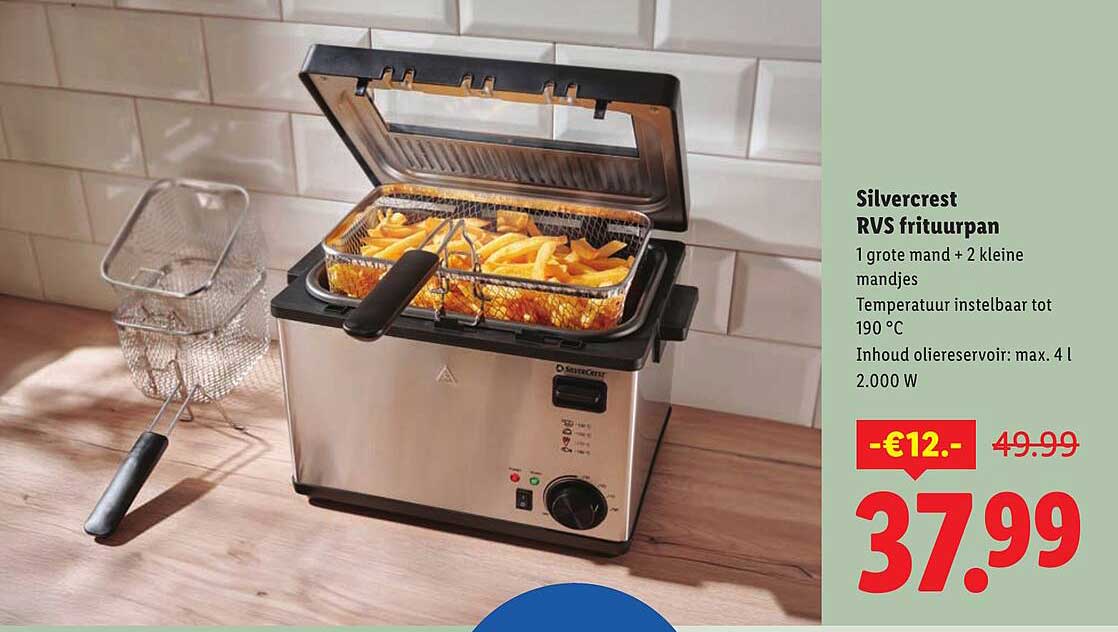 Ben je op zoek naar een kwaliteitsfrittuurpan die niet alleen functioneel is, maar ook een stijlvolle toevoeging aan je keuken? Kijk dan niet verder! Deze Silvercrest RVS frittuurpan is de perfecte oplossing voor een heleboel culinaire avonturen. Met deze aanbieding profiteer je niet alleen van een kwalitatief hoogstaand product, maar ook van een aantrekkelijke prijs. Laat je niet afschrikken door de originele prijs van €49,99, want nu kun je deze frittuurpan voor slechts €37,99 bemachtigen!
