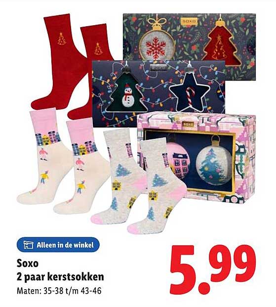 Bekijk nu de Soxo 2 paar kerstsokken aanbieding in de Lidl folder. Deze aanbieding is geldig van 24-11-2025 tot en met 30-11-2025.