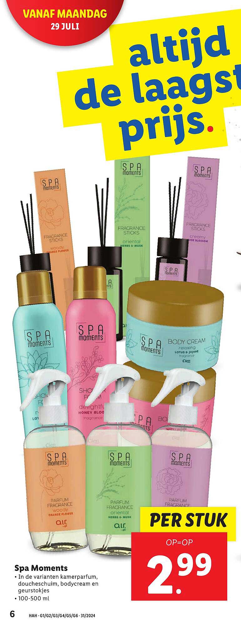Bekijk nu de Spa Moments: Kamerparfum, Douchegel, Bodycream en Geurstokjes aanbieding in de Lidl folder. Deze aanbieding is geldig van 29-07-2024 tot en met 04-08-2024.
