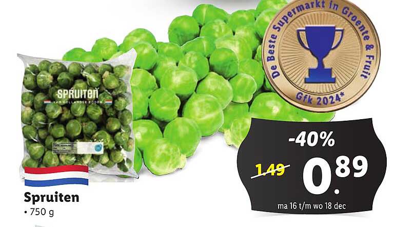 Bekijk nu de Spruiten aanbieding in de Lidl folder. Deze aanbieding is geldig van 16-12-2024 tot en met 26-12-2024.