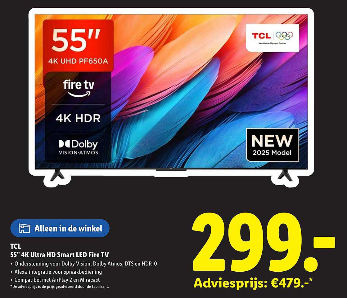 Bekijk nu de TCL 55" 4K Ultra HD Smart LED Fire TV aanbieding in de Lidl folder. Deze aanbieding is geldig van 24-11-2025 tot en met 30-11-2025.