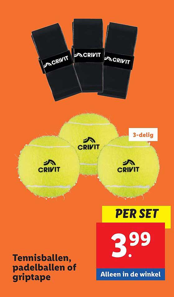 Bekijk nu de Tennisballen, padelballen of griptape aanbieding in de Lidl folder. Deze aanbieding is geldig van 26-05-2025 tot en met 01-06-2025.