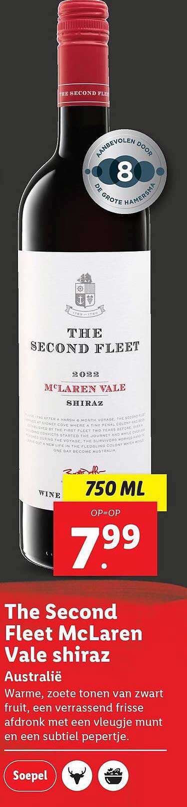 Ontdek de geweldige The Second Fleet Mclaren Vale Shiraz aanbieding in de nieuwste Lidl folder. Naast deze aanbieding vind je nog veel meer aantrekkelijke kortingen. Je kunt de The Second Fleet Mclaren Vale Shiraz eenvoudig online bestellen via de Lidl website of kopen in een winkel bij jou in de buurt.