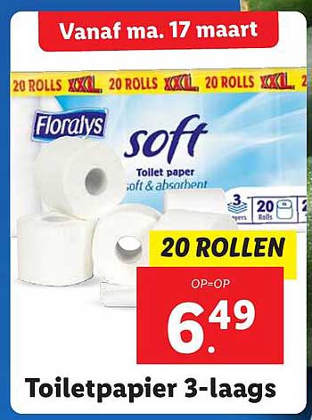 Bekijk de Toiletpapier 3-Laags aanbieding bij Lidl! Deze fantastische aanbieding is nu beschikbaar in de nieuwste Lidl folder. Profiteer van deze kans en bespaar flink op je aankoop.