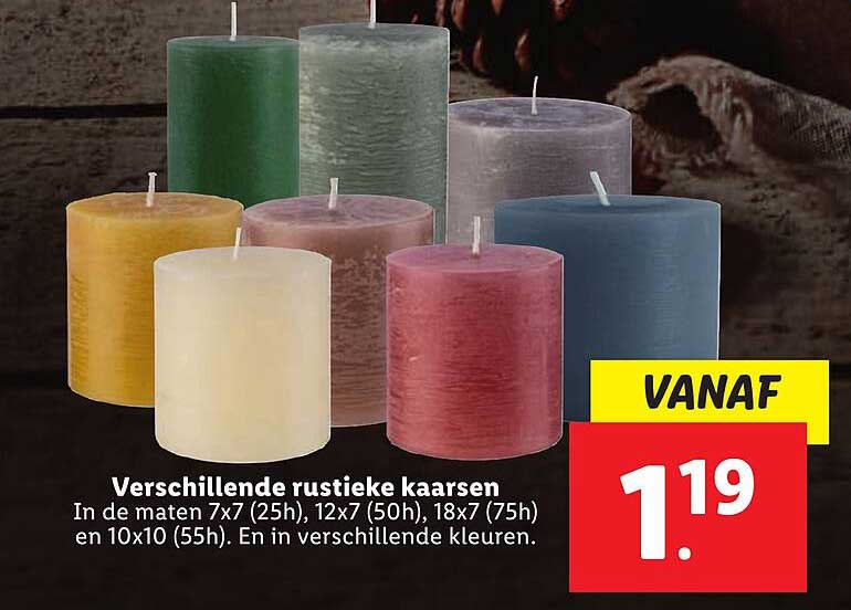 Bekijk de Verschillende Rustieke Kaarsen aanbieding bij Lidl! Deze fantastische aanbieding is nu beschikbaar in de nieuwste Lidl folder. Profiteer van deze kans en bespaar flink op je aankoop.
