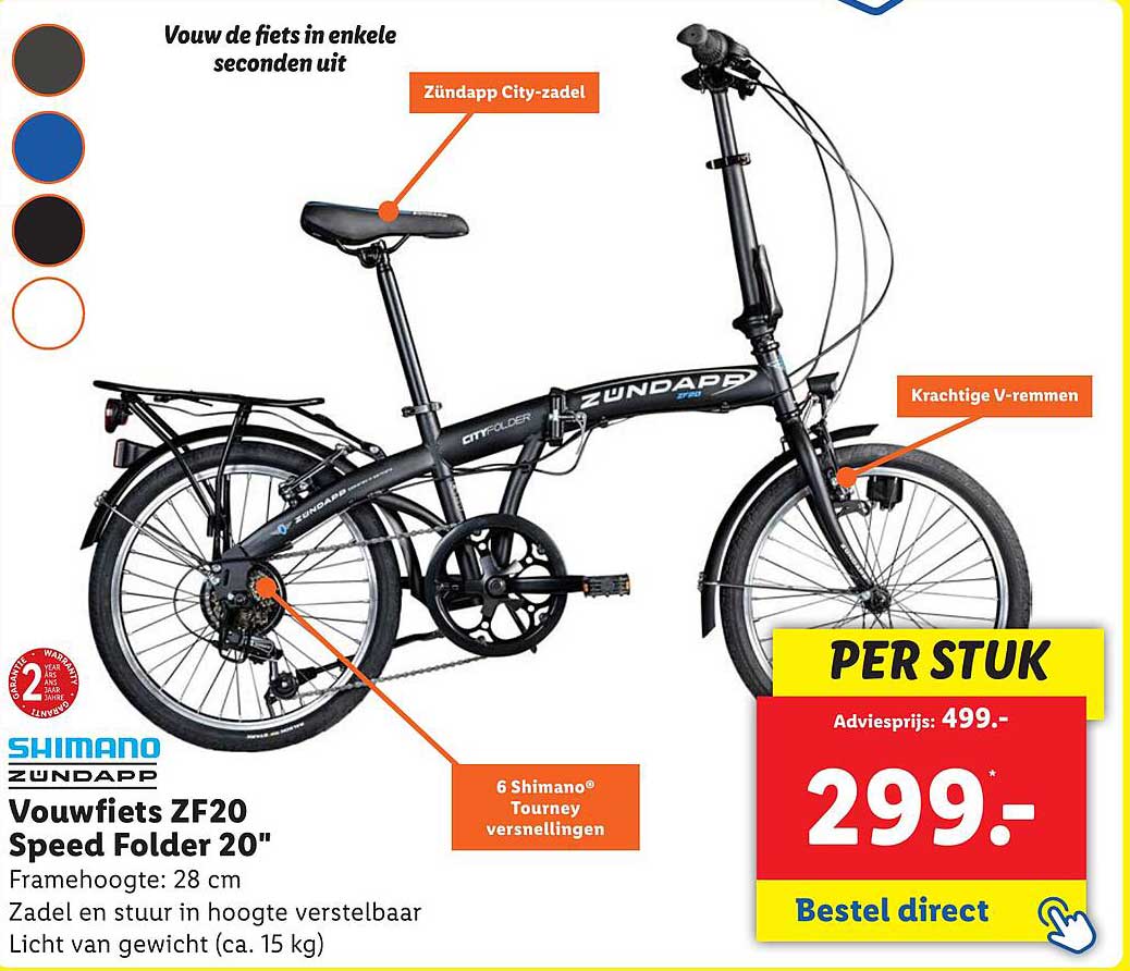 Ben je op zoek naar een compacte en handige fiets voor in de stad? Dan is de vouwfiets ZF20 Speed Folder van Zündapp wellicht precies wat je nodig hebt! Met een voordeel van maar liefst €200,- op de adviesprijs geniet je nu van deze uitstekende aanbieding. Deze fiets is perfect voor dagelijks gebruik en is eenvoudig op te bergen of mee te nemen in het openbaar vervoer.