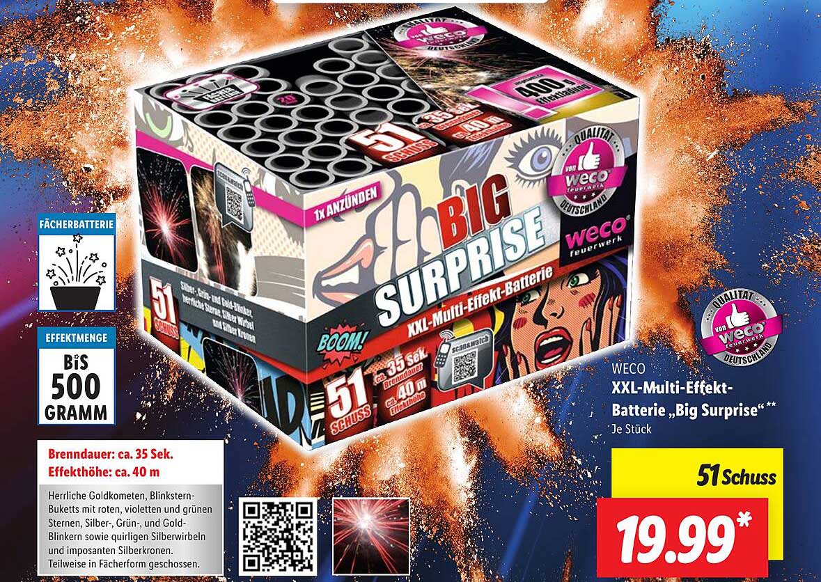 Bekijk de Weco Xxl-Multi-Effekt-Batterie „Big Surprise“** aanbieding bij Lidl! Deze fantastische aanbieding is nu beschikbaar in de nieuwste Lidl folder. Profiteer van deze kans en bespaar flink op je aankoop.