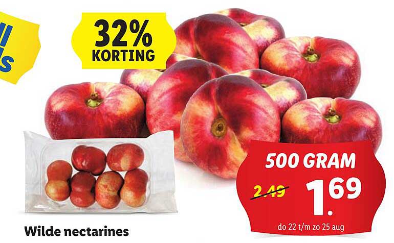 Bekijk nu de Wilde nectarines aanbieding in de Lidl folder. Deze aanbieding is geldig van 19-08-2024 tot en met 25-08-2024.